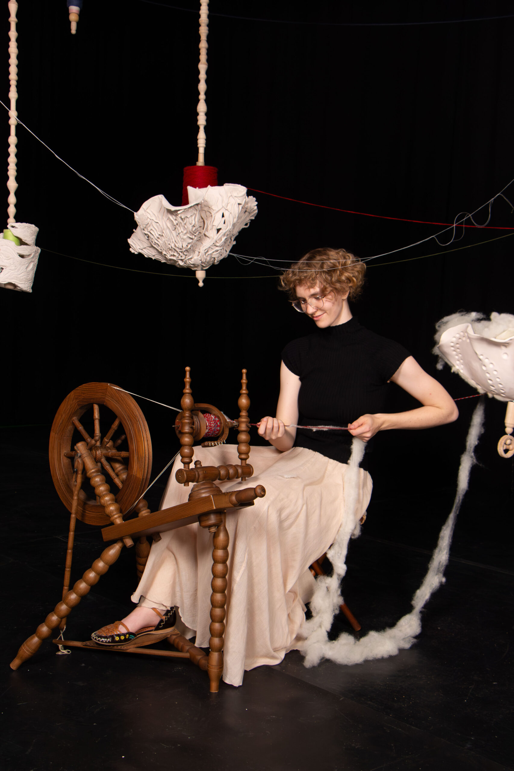 ‘De installatie komt tot leven tijdens mijn performance: ik spin variërende klossen tot kleurrijk en sterker draad achter mijn familie erfstuk spinnenwiel. De draden komen vanuit alle klossen bij elkaar en vormen een sterke verbinding.’ Beschrijft Femke. Ze documenteert dit proces en is te vinden door de externe link te volgen op op YouTube te zoeken naar “Anders, Samen, Sterker” door Artstudiofemke.